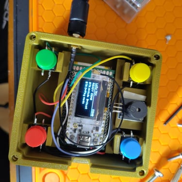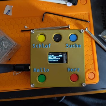 SCHLAF-Modus: Ein Druck auf den gelben Knopf schickt den ESP32 in den Deep Sleep, um Batterie zu sparen. Ein erneuter Druck auf den selben Knopf weckt das Gerät wieder auf.